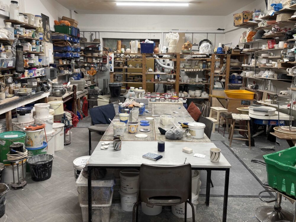 A working pottery, kilns, wheels, benches, ceramic colours, glazes, pots in various stages. A wide selection of finished pots.
