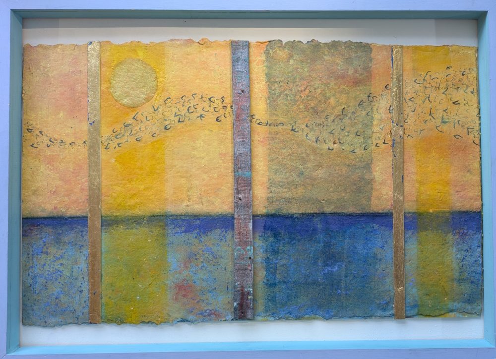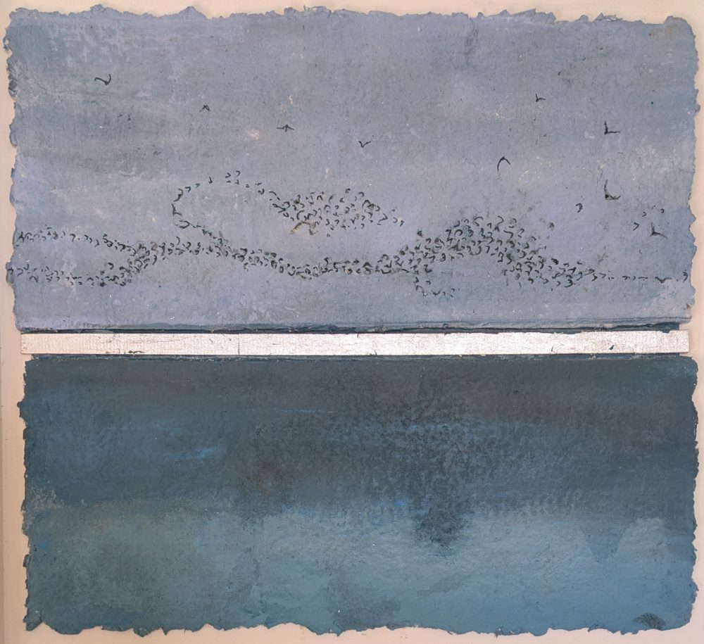 Jill’s work is experimental, concentrating on colour, light, intensity and atmosphere. Frequent subjects are seascapes, night skies and patterns in the natural world. She often works on her own handmade paper and uses paints, inks, pigments, dyes and silver and gold leaf alongside reclaimed and found materials.