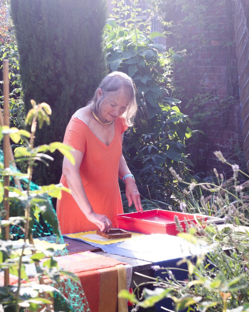 Paintings and cards on display. Separate framing/papermaking space with equipment and demonstrations – in courtyard too, weather permitting. Folding books, work in progress, processes and materials on view. Visitors are welcome to look, touch and ask.
