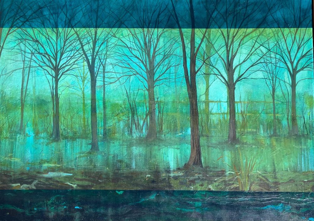 Pennie creates immersive, atmospheric landscape paintings inspired by location sketches, film, and music. Her work explores contrasts of emotion through layered texture, colour, light, and multiple thin layers of oil paint.