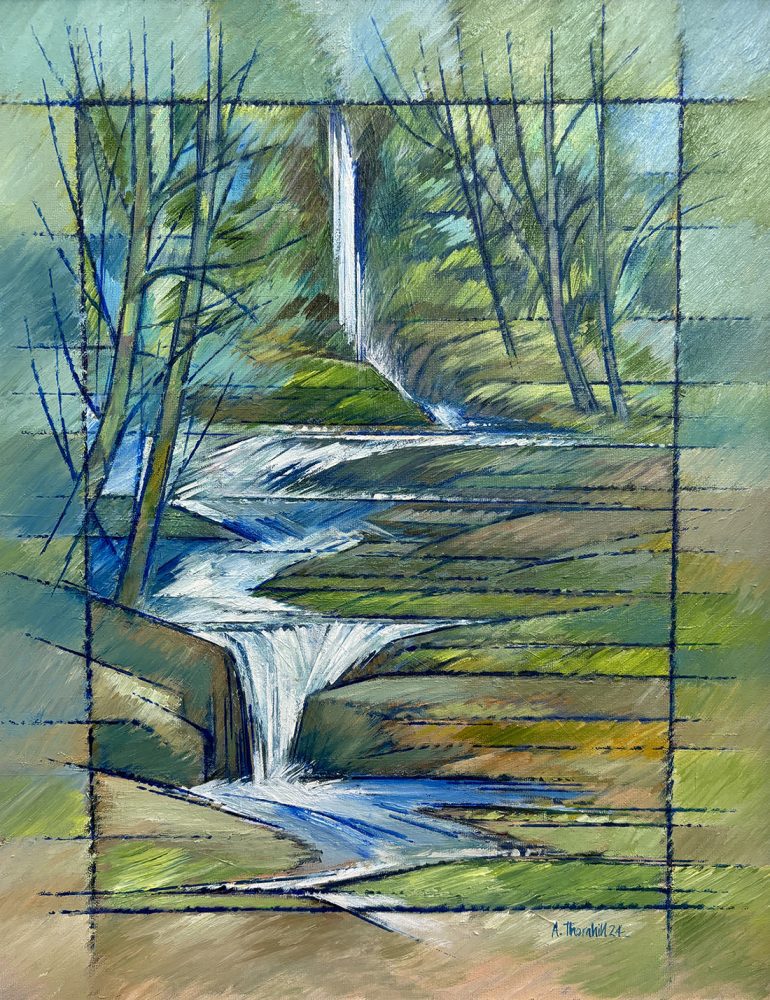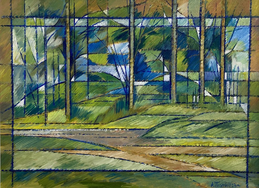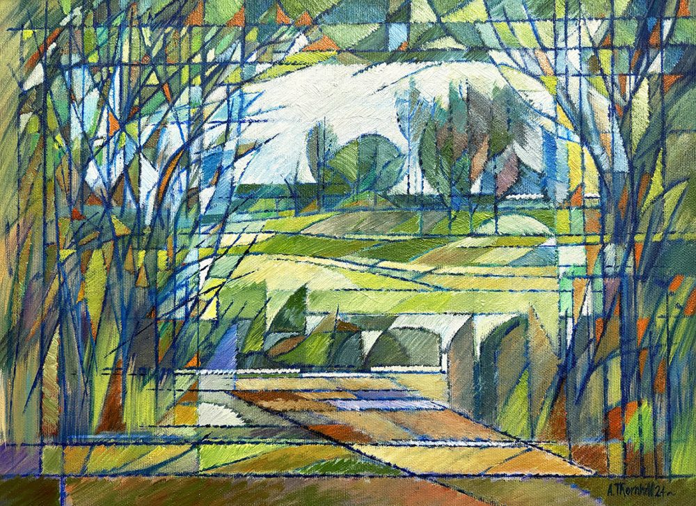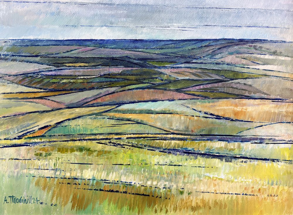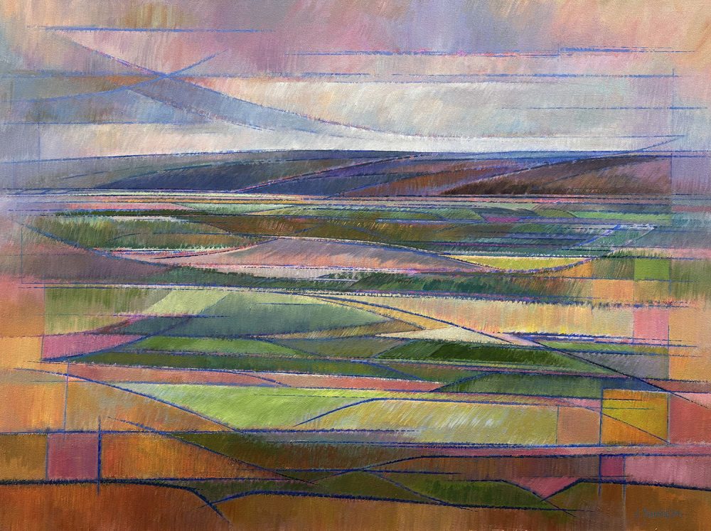 Anne’s landscapes reflect a shift between representation and abstraction, using a linear framework to pull the viewer into different journeys within the picture space. She works in oils from drawings made on site.